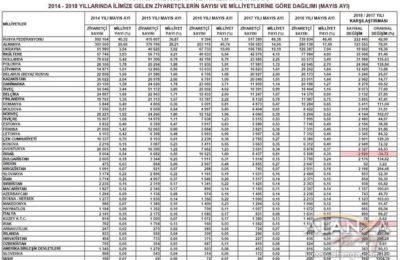 [:tr]Mayıs ayında Antalya'ya gelen ziyaretçilerin sayısı ve milliyetlerine göre dağılımı.[:]