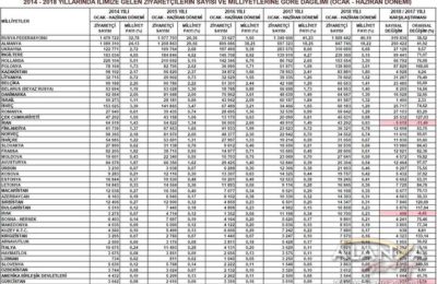 [:tr]Ocak-haziran döneminde Antalya'ya gelen ziyaretçilerin sayısı ve milliyetlerine göre dağılımı.[:]